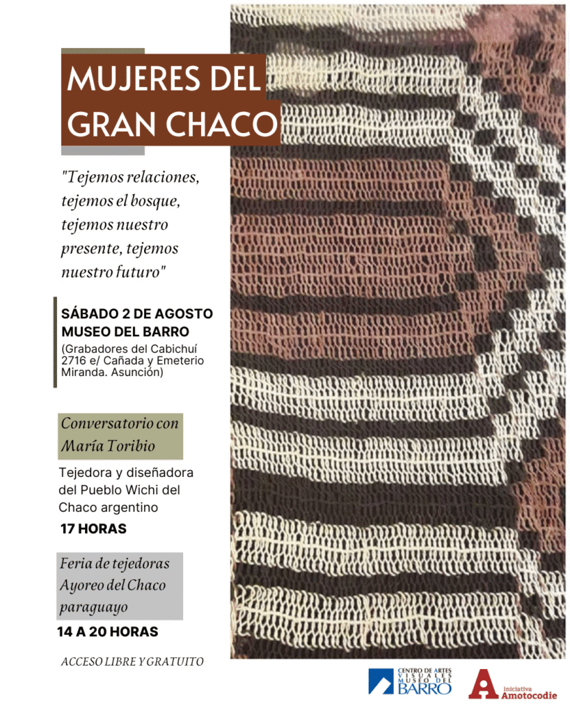 En Asunción, María Toribio dará una charla en el Museo del Barro (Grabadores del Cabichuí 2716 e/ Cañada y Emeterio Miranda) el sábado 2 de agosto a las 17 horas. Ese día, habrá feria de tejedoras Ayoreo de 14 a 20 horas. Las actividades serán de acceso libre y gratuito.